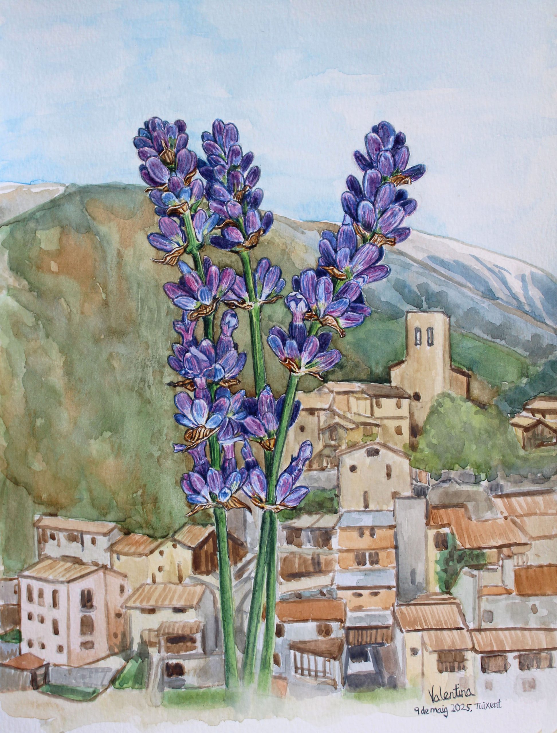 Original watercolour painting of a poppy with the town of Tuixent in the background. A town in the Catalan pyrenees in the  land of medicinal plants.